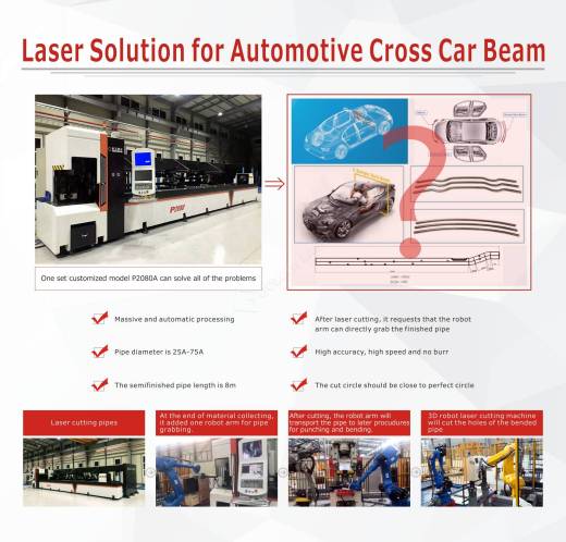 Golden Laser helps one of the famous Automobile brands to set an automatic cross-car beam laser cutting solution line. After the laser tube cutting machine finished the hollowing on the tubes, the Robot Arm will collect the tube before it falls down to the ground, it collects the tubes for bending and hollowing in other positions. It is an automatic production line solution to increase your production efficiency.